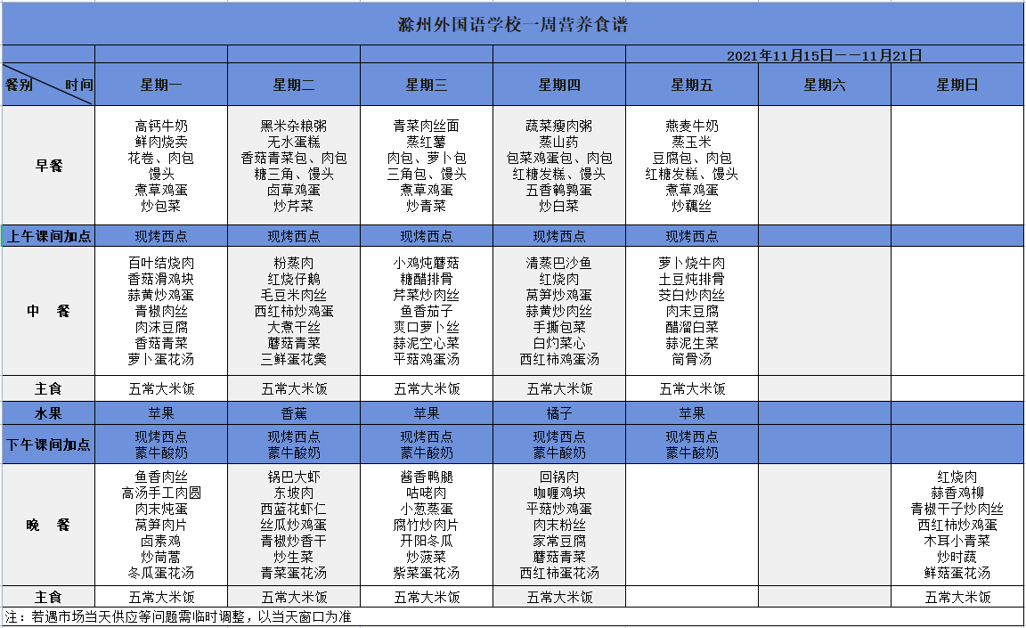 滁州外国语学校菜谱公示(2021.11.15-11.21)