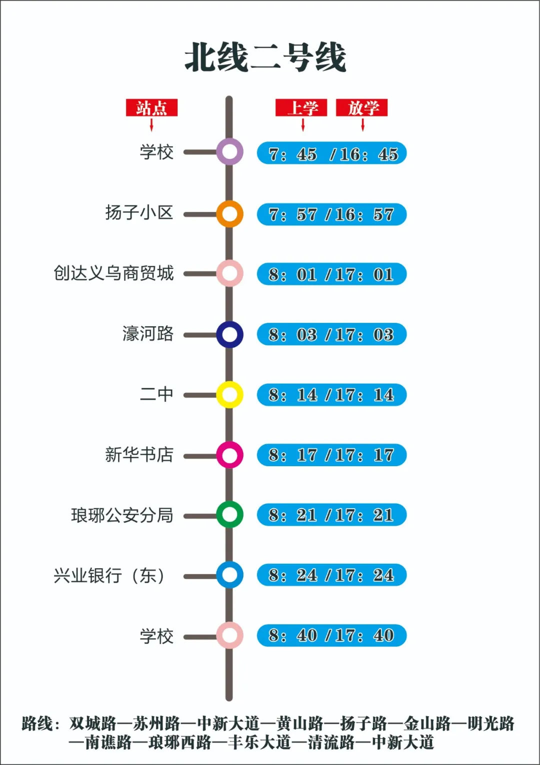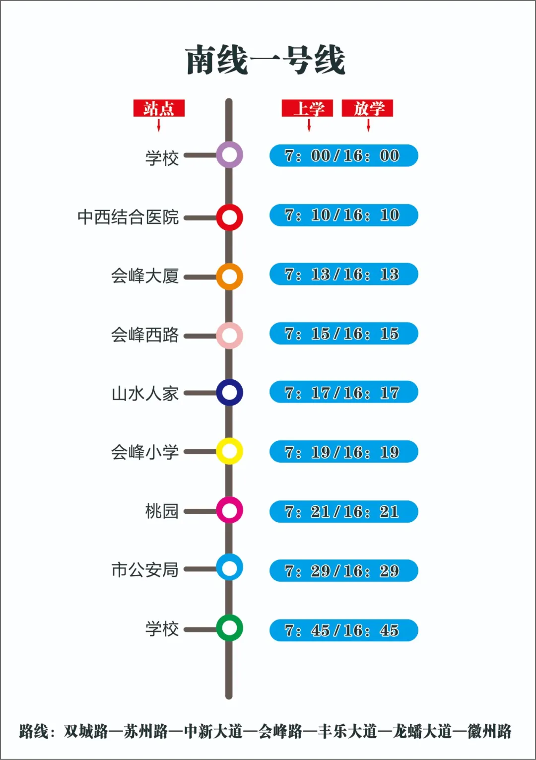 为更加便利学生上下学和家长接送,提供优质校车服务,学校经多次实地考察、反复研究后,现决定:9月1日起,对校车线路、接送时间作出相应调整。确保每一个坐校车的孩子安全回家!