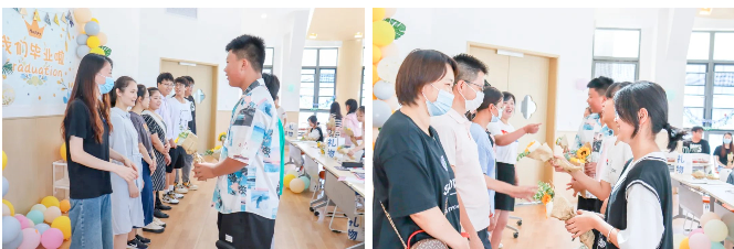 随后音乐的响起,典礼进行到最后一项,学生代表向老师、家长献花,师恩难忘,感恩父母。最后师生共同分享蛋糕,分享这难忘的毕业瞬间。