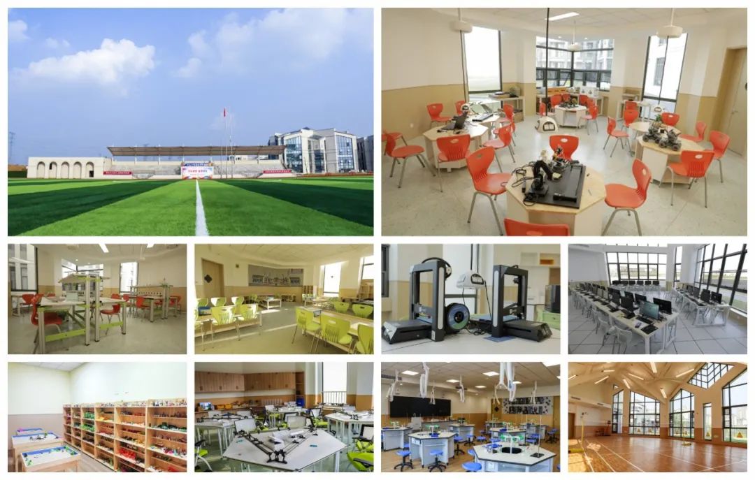 学校建筑风格中西合璧、美轮美奂,室内装潢简洁温馨,办学条件配套完善。建有“STEAM”活动中心、心理健康中心、舞蹈房、艺术教室、报告厅、图书馆、演艺厅;400米标准田径场、足球场、篮球场、排球场、羽毛球场、健身房、室内小型体育馆一应俱全。