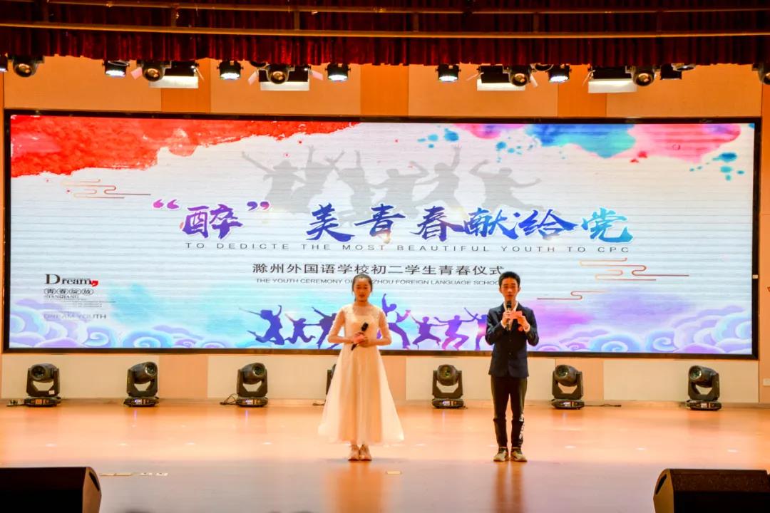 到场本次青春仪式的领导和嘉宾有:滁州外国语学校总校长郭富慧先生,执行校长、党总支书记孙立新先生,常务副校长童万俊先生,校长顾问兼小学部校长陈校长,副校长兼初中部校长杨晓莉女士,八(1)班学生家长李坚先生,以及部分家长代表和初一、初二年级的全体师生们。