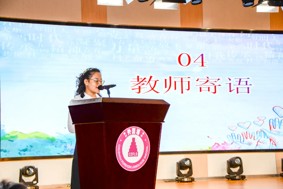 聆听完同学们的青春宣言,不要忘记,青春的路上还有一直陪伴我们的老师,教师代表朱向玲老师面带微笑,向同学们发表青春寄语。