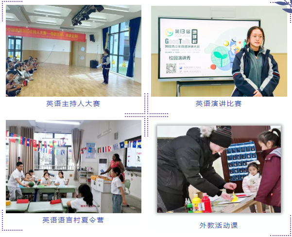 英语主持人大赛、英语思维导图评比、英文书法大赛、演讲比赛、英语歌曲比赛、配音比赛、戏剧比赛、英语社团PK、一年一度的“外语文化节”、英语语言村夏令营......每学期推陈出新,各项活动应接不暇,同时外教全程参与各项活动,对学生进行全方位指导和评价。