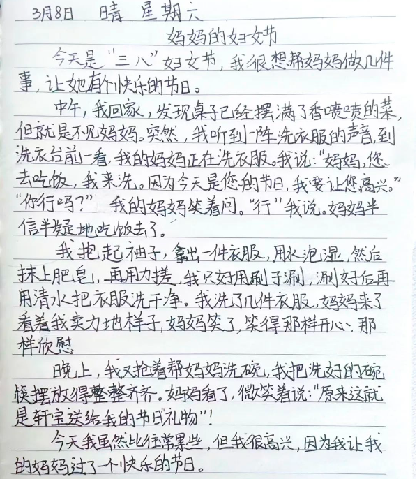 高年级的同学迎来了深度的角色体验。在3月8日这天,他们“当起了妈妈”,承担准备早餐、整理房间等工作,在体验中感受妈妈的不易,撰写的体验日记更是充满了深刻的感悟。这不仅是一份礼物,更是爱的见证。