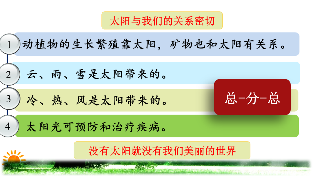 同学们从太阳找朋友中学到了太阳的特点,接着,李老师课堂中的小亮点又来了:“太阳公公找不到朋友,他要伤心了,他想:我干脆消失算了,同学们,太阳公公能消失吗?”通过这样巧妙的课堂创设,同学们热烈讨论,又学到了太阳与人类关系密切的方方面面。