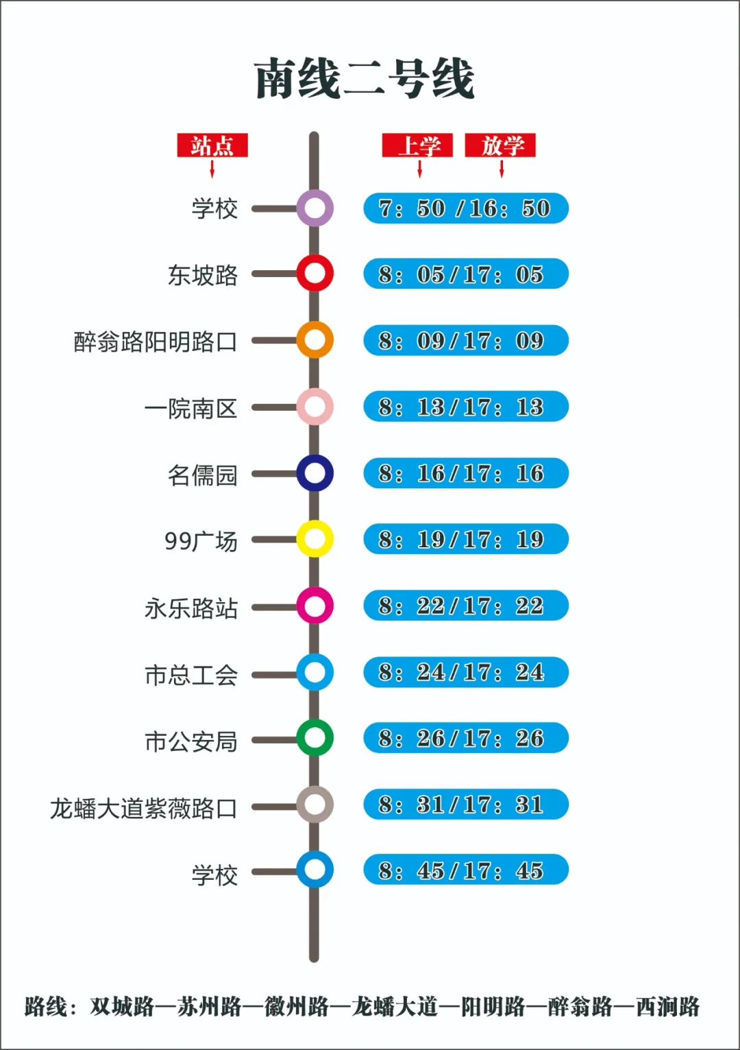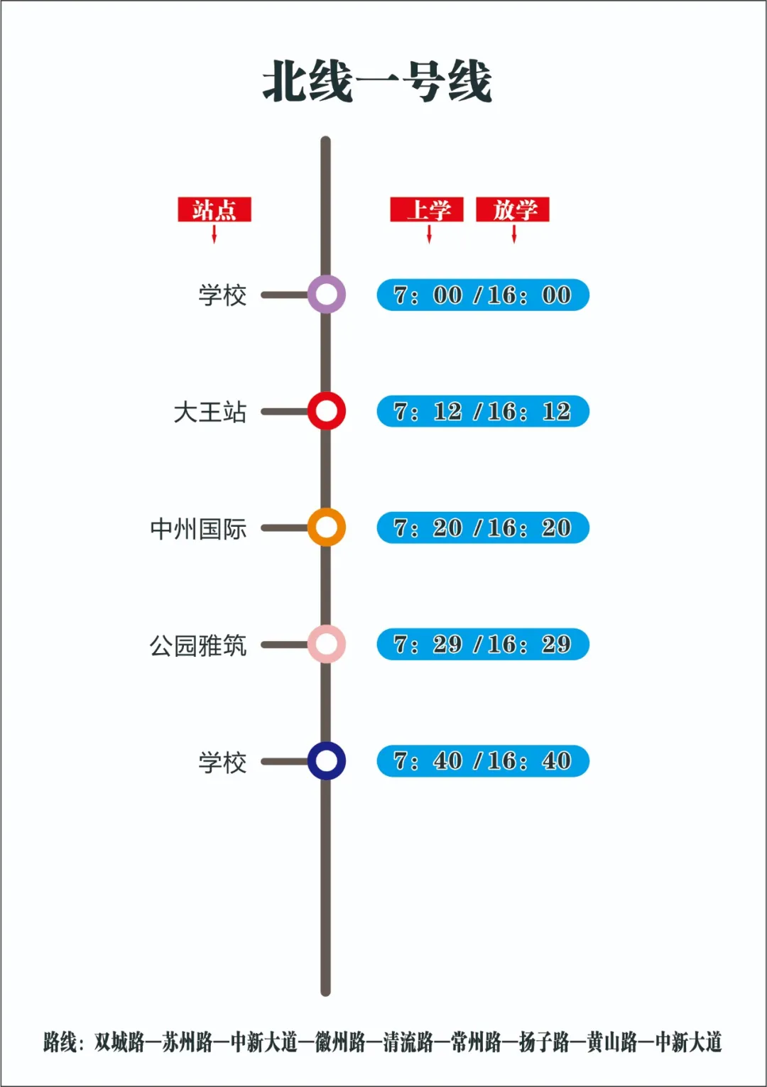 为更加便利学生上下学和家长接送,提供优质校车服务,学校经多次实地考察、反复研究后,现决定:9月1日起,对校车线路、接送时间作出相应调整。确保每一个坐校车的孩子安全回家!
